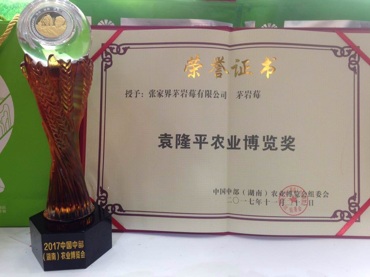 11月24日,為期七天的2017中國中部(湖南)農業(yè)博覽會在長沙落幕,23日下午在長沙國際會展中心舉行了閉幕式暨頒獎典禮。頒獎典禮上公布了20個農博會設計獎、42個農博會組織獎和122個農博會產品金獎。另外,備受矚目的以袁隆平院士名字命名的“袁隆平農業(yè)博覽獎”公布了獲獎名單,7個品牌產品榮獲大獎;其中,張家界茅巖莓有限公司的“茅巖莓茶”榮獲此獎。